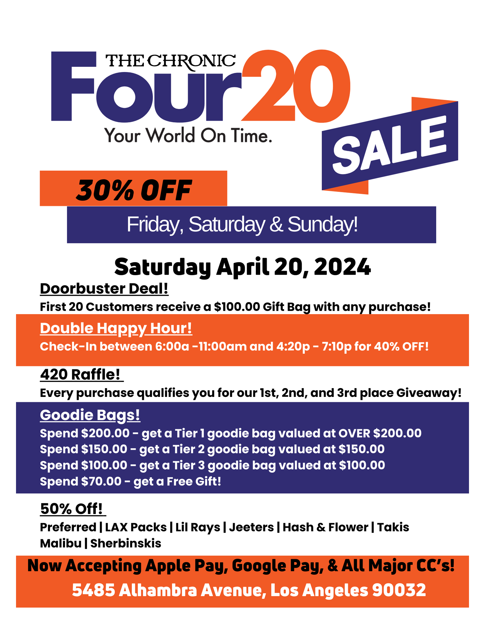 Back to All Events Four20 Friday, April 19, 2024 6:00 AM Sunday, April 21, 2024 10:00 PM The Chronic 5485 Alhambra Avenue Los Angeles, CA, 90032 United States (map) Google Calendar ICS