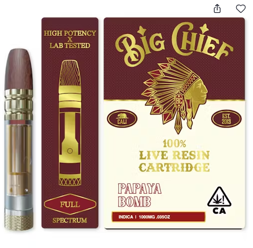 This 1-gram live resin cartridge is compatible with most standard 510-thread vape batteries and engineered for smooth airflow, even heating, and reliable vapor production. Big Chief’s premium hardware ensures clean, flavorful, and satisfying hits from the first puff to the last.