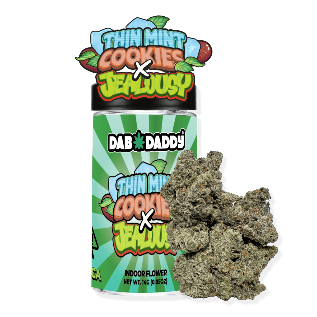 The Dab Daddy - Flower - Thin Mint Cookies x Jealousy - 14G is a half-ounce (14-gram) package of premium indoor-grown cannabis flower, featuring an elite hybrid cross bred by Seed Junky Genetics. This cultivar is typically classified as an Indica or Indica-dominant Hybrid. It is known for its high potency, with THC levels commonly reported between 24% and 29.22% THC (though some listings show up to 34.44%). The flavor profile is a sophisticated, dessert-like fusion, blending the signature sweet mint, rich vanilla, and earthy dough of Thin Mint Cookies with the creamy, fruity sweetness of Jealousy. Its effects deliver a powerful yet versatile high that starts with a focused, euphoric calm and mental clarity, quickly transitioning into a profound, body-melting physical relaxation and tranquility, making this a highly flavorful and effective choice for experienced users seeking evening stress relief, creative focus, and deep unwinding.