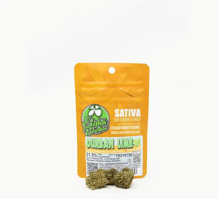 Get your energy boost with the Eighth Brother Durban Lime Flower (7G / Quarter-Ounce), featuring a generous supply of this vibrant Sativa-dominant hybrid. A cross between the classic energizer Durban Poison and the bright Lime Haze, this strain is celebrated for its potent, functional, and euphoric effects.
