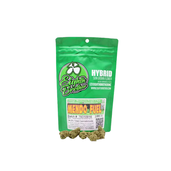 Get a balanced dose of relief with the Eighth Brother Mendo Fuel Flower (7G / Quarter-Ounce), featuring a generous supply of this popular, complex Hybrid strain. Combining genetics from the soothing Mendocino line with the pungent punch of Fuel strains, it provides an even blend of mental uplift and bodily calm.