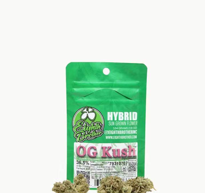 Secure a piece of cannabis history with Eighth Brother OG Kush Flower (3.5G), the perfect eighth-ounce size of this globally recognized and highly potent Hybrid strain. OG Kush is a foundational genetic pillar, celebrated for its unique, complex flavor profile and reliably strong effects that lean toward deep, calming relaxation.