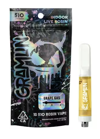 "Gramlin 510 Rosin carts are fire in, fire out at its finest. Grape Gas’s profile blends strong diesel gas and creamy fruit flavors by crossing Grape Pie x Jet Fuel Gelato for a potent combo that hits hard with a couch-locking high. Taste the terps with a fully ceramic system designed to protect each strain’s unique terp profile. Our solventless rosin is pressed from ice water hash that’s extracted from fresh-frozen indoor flower straight out of our grow. We are the growers. We are the processors. We control the run from seed to press to put fire flavor in every cart. - 1g Indoor Live Rosin - 100% Ceramic Cart - Grape Gas: Grape Pie x Jet Fuel Gelato - Strong Diesel Gas and Creamy Fruit - Indica Dominant"