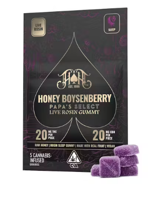 "UNWIND WITH THE RICH, SOOTHING FLAVOR OF HONEY AND BOYSENBERRY, INFUSED WITH FIRST-PRESS LIVE ROSIN FROM AWARD-WINNING PAPA SELECT HASH. THIS FULL-SPECTRUM GUMMY BLENDS CBN AND THC FOR A NATURALLY POTENT, DEEPLY RELAXING SLEEP EXPERIENCE.