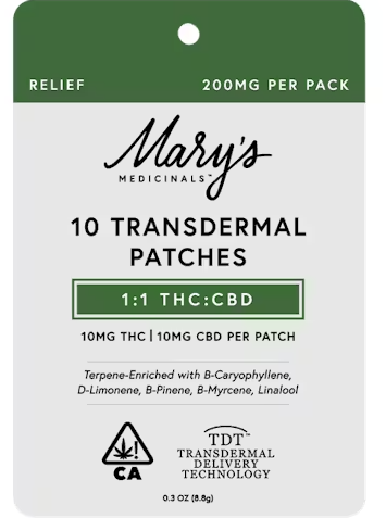 Mary’s award-winning Transdermal Patches are now available in a 10-pack for everyday self-care. Each 10-pack of Mary's Patches contains 2x2" squares that simply adhere to any veinous part of the skin, providing 8-12 hours of discreet systemic relief. Our Relief Transdermal Patch, with a 1:1 CBD:THC ratio, is designed to promote relief from common aches and pains in your daily life. Our Everyday Relief products are formulated with natural ingredients that provide systemic relief from daily stressors. Winner of the 2023 Michigan and SoCal High Times Cups, Mary’s Medicinals Relief Transdermal Patch is sure to be a winner in your book as well.