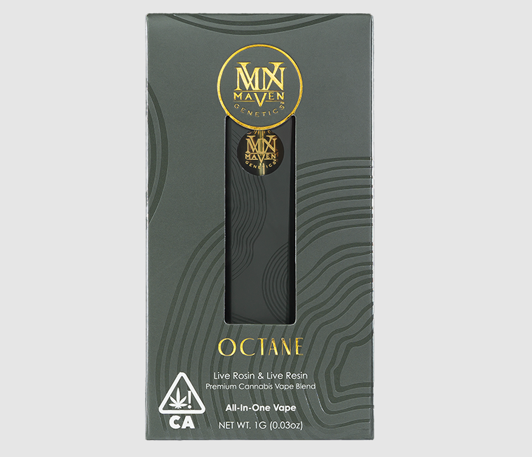The Maven disposable line includes a selection of potent, flavor-focused products categorized under the Gold Blend and Alchemy All-in-One lines. The Orange Bellini is a Sativa-dominant Gold Blend with an average THC of around 91%, known for its cerebral and uplifting effects and a profile of sweet, creamy, and bright citrus derived from Orange Truffle Soufflé and Peach Crème Gelato. For a heavier experience, the RS-X is an Indica-dominant Gold Blend cross of Black Diamond X and RS11, providing deep relaxation and a pungent mix of earthy diesel, sour citrus, and mixed fruit with a THC content typically around 89%. In the premium Live Rosin/Live Resin Alchemy line, the Desserts blend is a Hybrid offering rich, creamy confectionery notes of candied berries and cream for a balanced high in the 83%-86% THC range, while the Octane blend is a pungent, Indica-leaning favorite (around 84-87% THC) that releases powerful notes of skunk, diesel, and evergreen for robust and deeply relaxing effects.