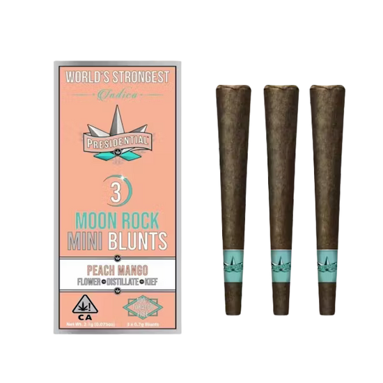 Blunts in this 3-pack of 2.1g Peach Mango flavored Moonrock Infused blunts weigh .7 grams a piece. Presidential provides you with top-shelf flower, premium kief, and THC distillate with a peacn mango flavor. You only need Presidential's Moon Rock-infused blunts to make your summer weekend enjoyable. To provide the smoothest possible hits, they are carefully rolled, filled with the finest top-shelf flower, and furnished with a chlorine-free filter. These high-end blunts are NEVER rolled, sprayed, or dipped and ALWAYS contain quality distillate and kief. These Presidential blunts are recommended for those who have a high tolerance or are looking for a good time since they will transport you to the moon and back.