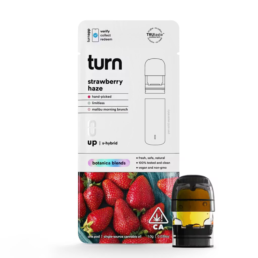 The Turn Strawberry Haze Pod (1G / 1000mg) is a high-potency oil cartridge designed for the proprietary Turn PodPak system. This specific flavor is part of Turn's Botanica Blends line, which features ultra-pure, single-source cannabis oil distillate infused with natural botanical terpenes to create its signature bright flavor profile. The Turn Pod system is engineered with precise heating technology for consistent flavor and a smooth draw.